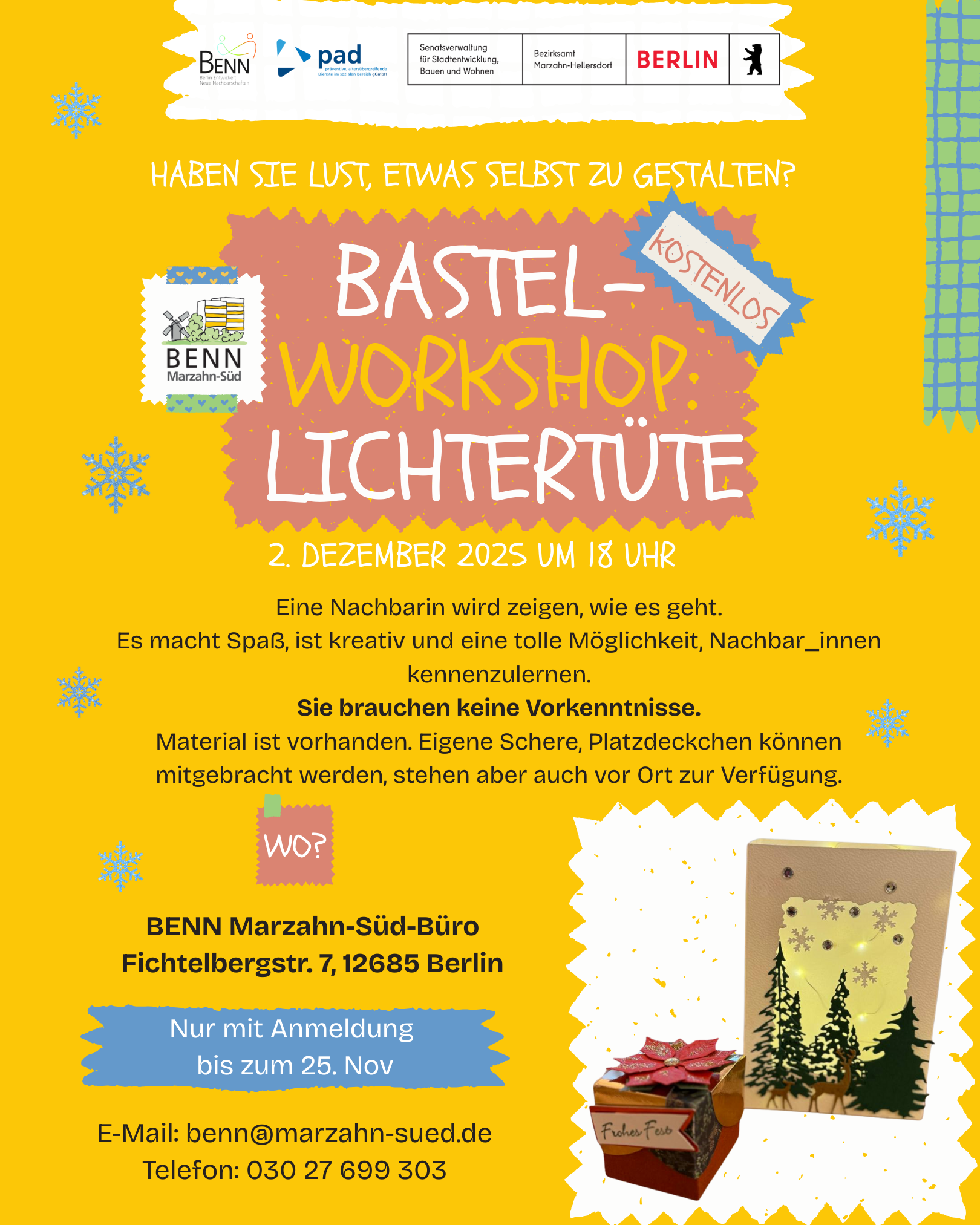 Material ist vorhanden. Eigene Schere, Platzdeckchen können mitgebracht werden, stehen aber auch vor Ort zur Verfügung.