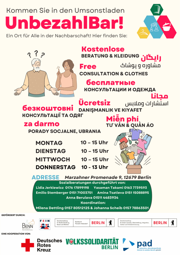 Die „UnbezahlBar“ gibt es seit dem Frühjahr 2023. Sie wird gemeinsam von mehreren Organisationen getragen, darunter die Volkssolidarität e.V., das Deutsche Rote Kreuz Berlin Nord-Ost e.V., BENN Marzahn-Süd und BENN Blumberger Damm.